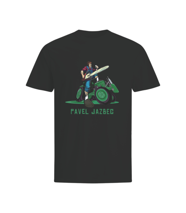Kratka črna majica z motivom gozdarja na sprednji strani.